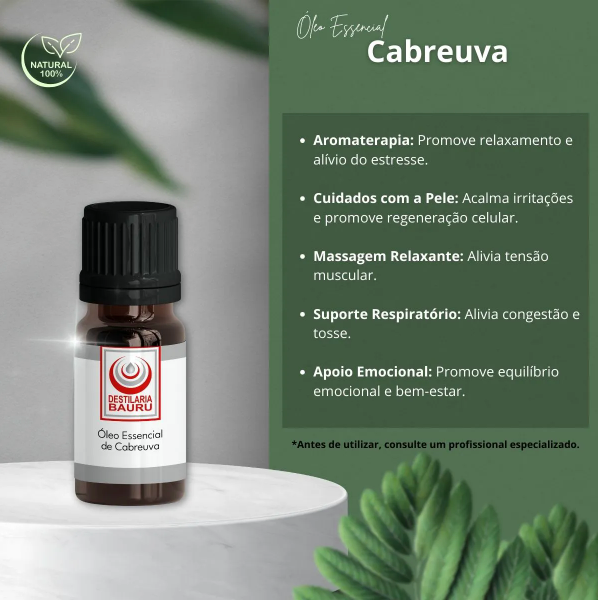 Aromaterapia Relaxante: O óleo essencial de Cabreúva é amplamente utilizado em aromaterapia devido ao seu aroma suave e reconfortante. Sua inalação pode promover relaxamento e alívio do estresse.